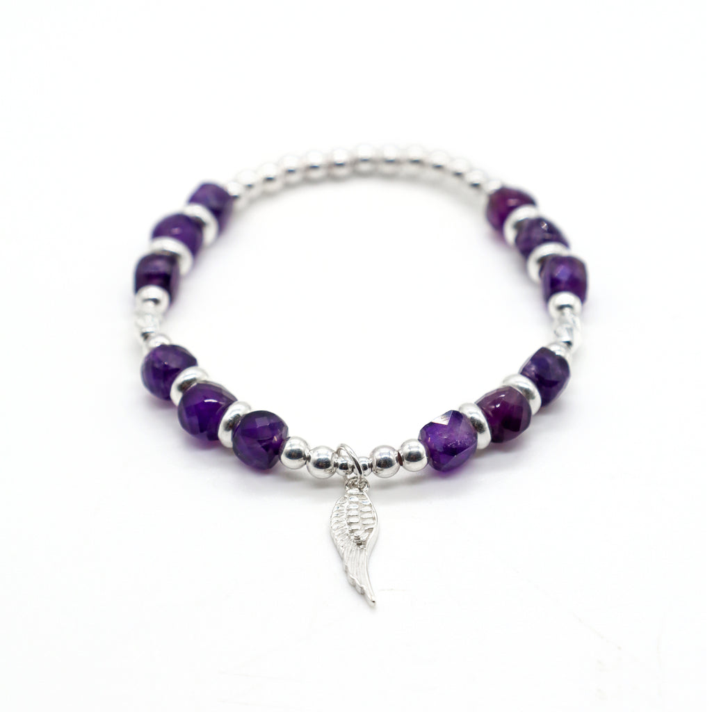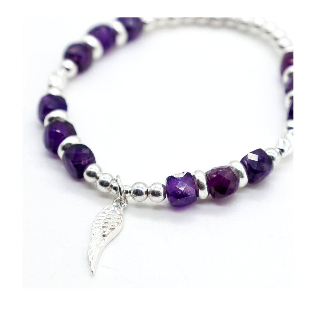 Crafted with genuine 6mm Amethyst diamond cut square beads with a Sterling Silver Angel Wing Charm and beads. This easy to wear comfortable stretch bracelet is handmade with love and intention. Looks stunning on its own or add from our collection to make your own energy stack!
