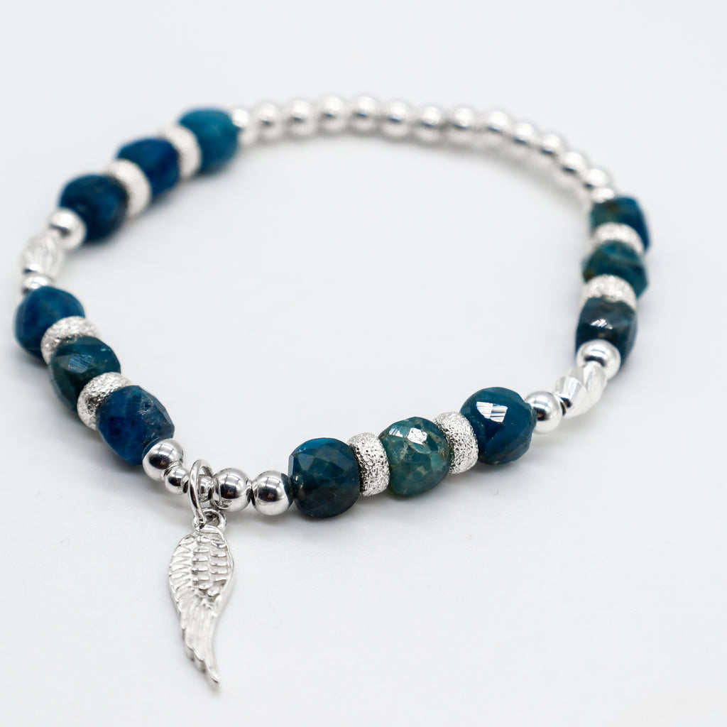Crafted with genuine 6mm Apatite diamond cut square beads with a Sterling Silver Angel Wing Charm and beads. This easy to wear comfortable stretch bracelet is handmade with love and intention. Looks stunning on its own or add from our collection to make your own energy stack!