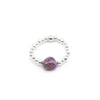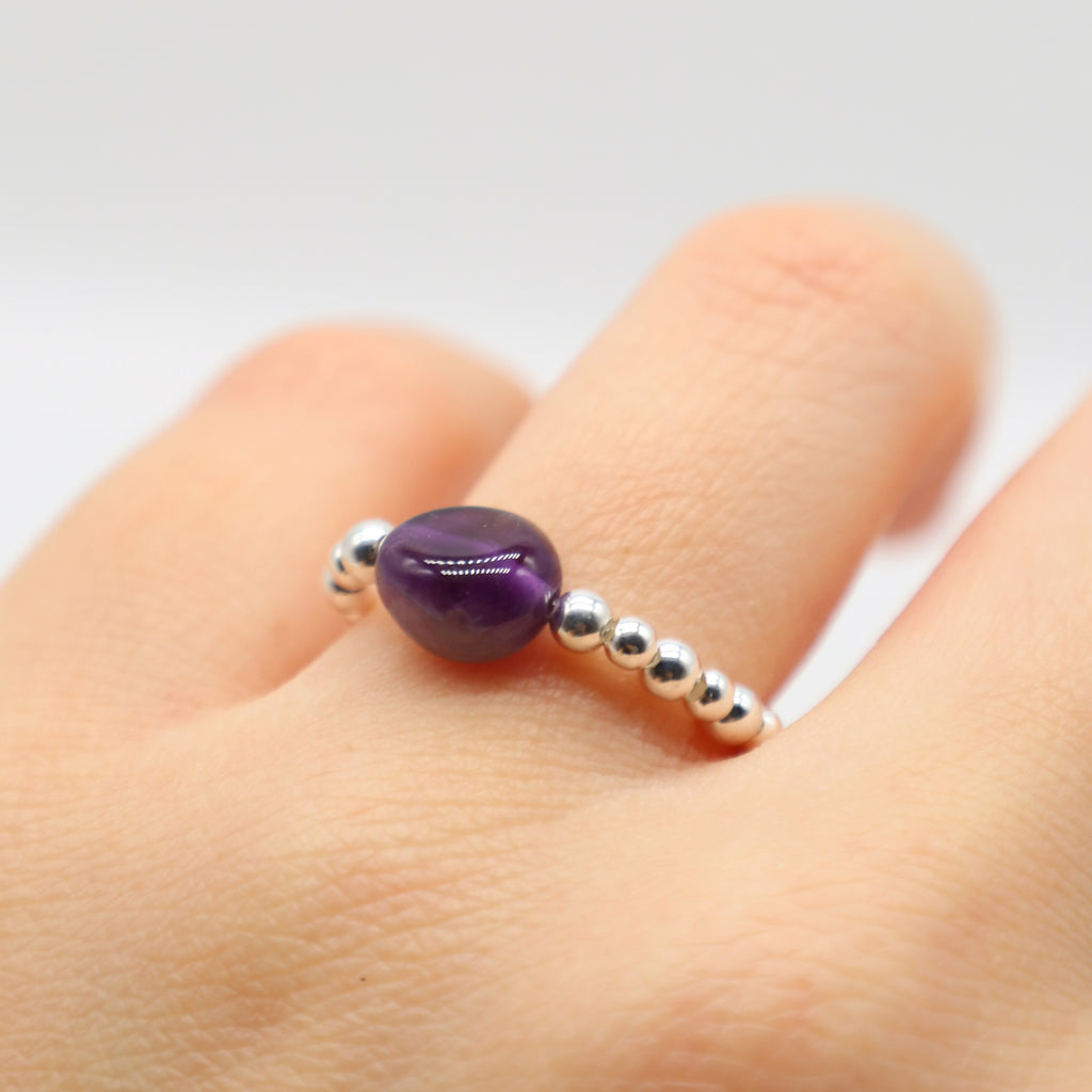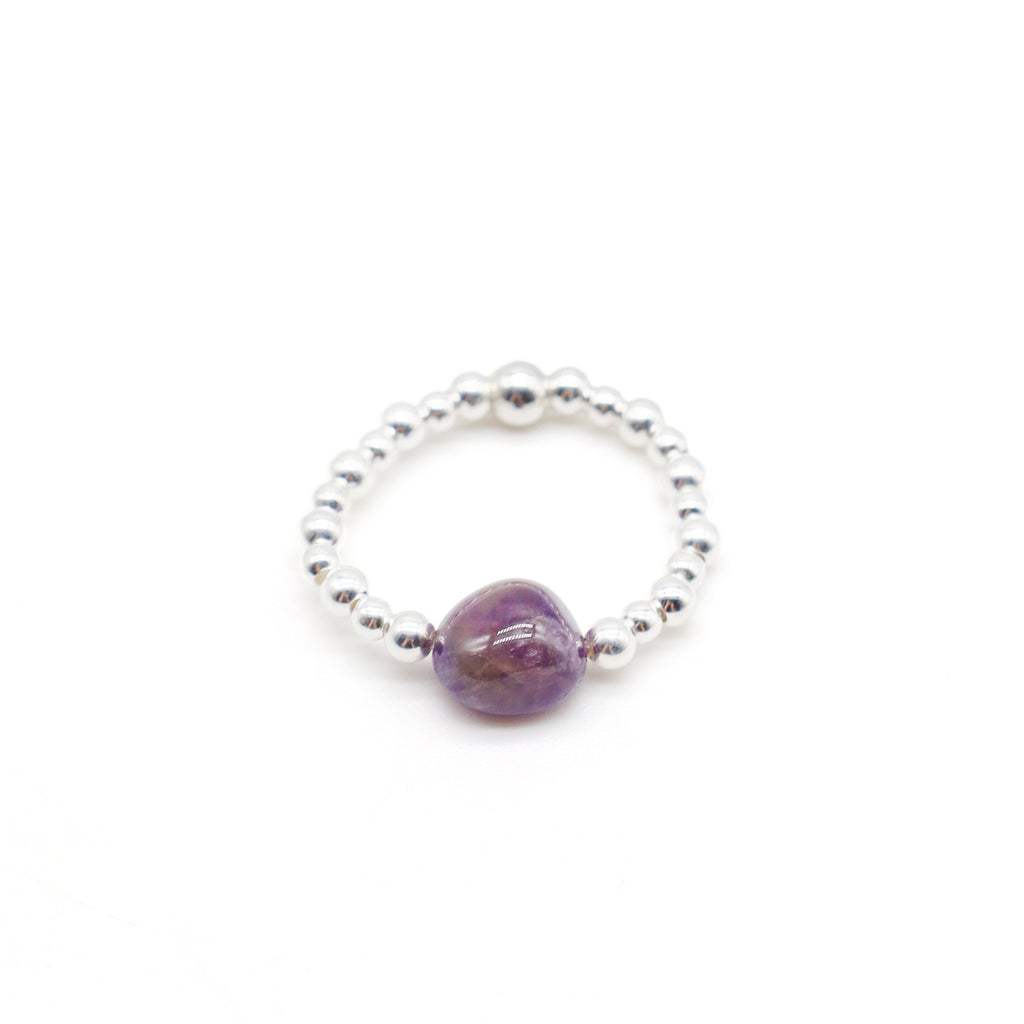 • Comfortable stretch Sterling Silver ring made with 2 & 3mm Sterling Silver beads and an Amethyst Pebble Stone.